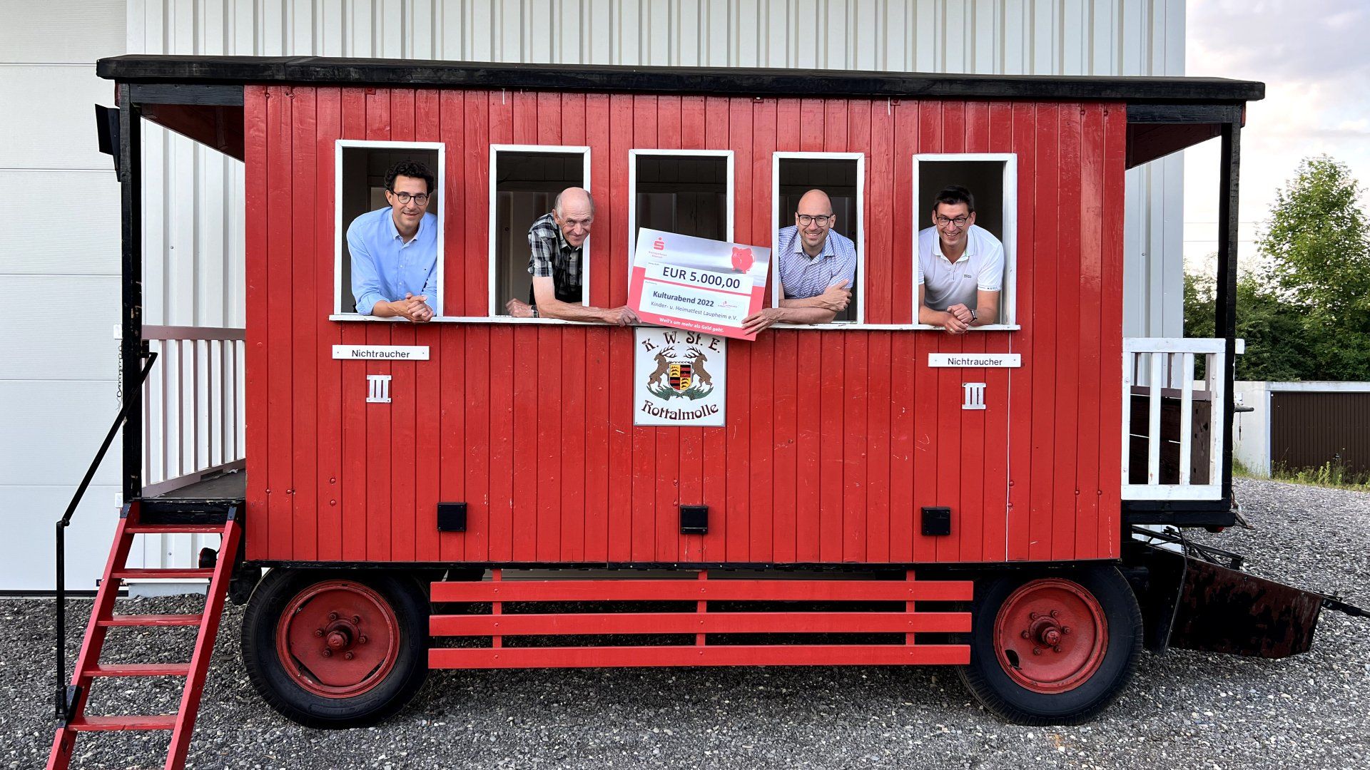 Scheckübergabe in der Rottalmolle mit Fridolin Schmid (li.) und Frank Schneider (2.v.re.) von der Bürgerstiftung und Johannes Welz (2.v.li.) und Christian Rosteck (re.) vom Verein „Kinder- und Heimatfest Laupheim e.V.“