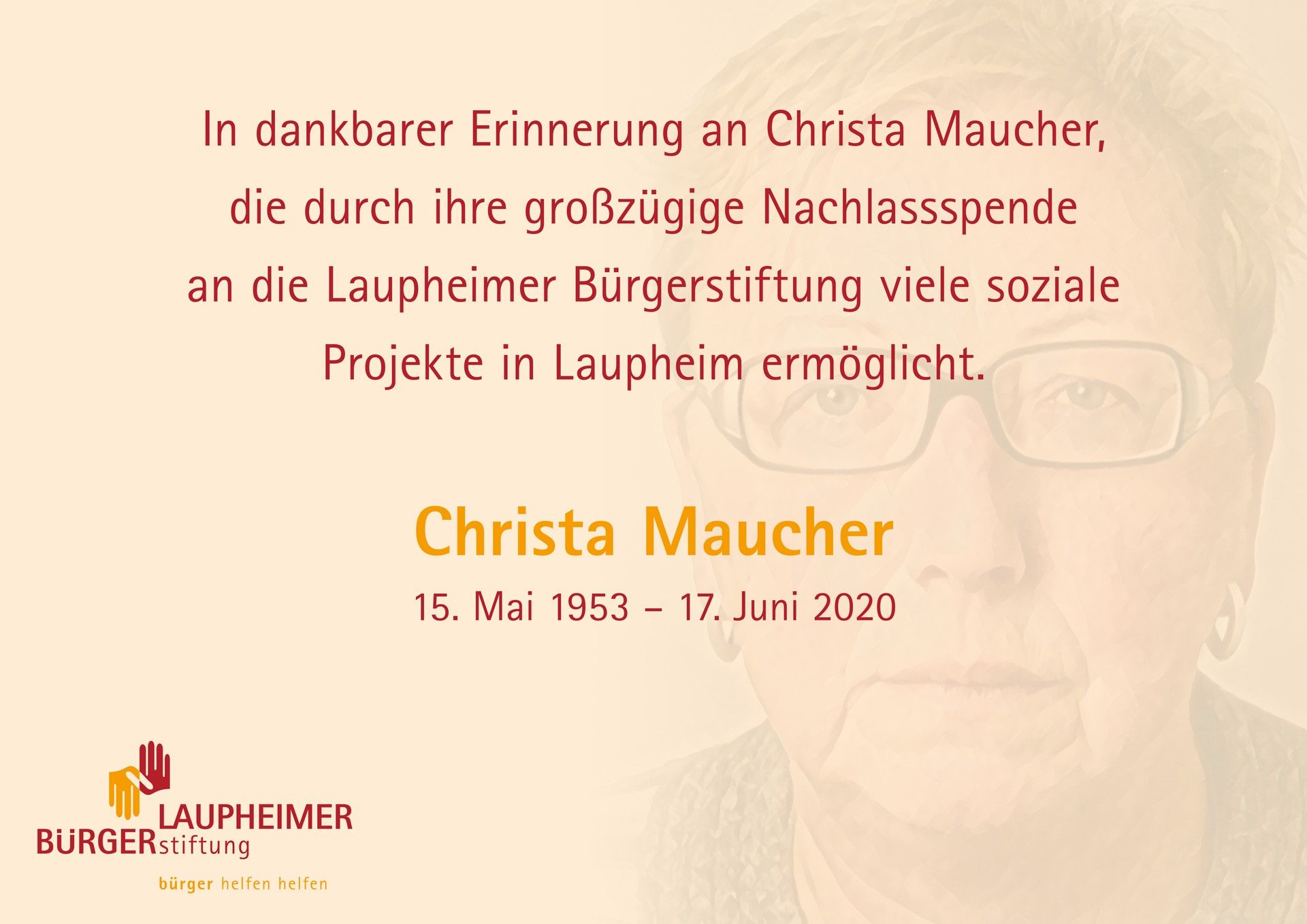 Die Nachlassspende (1 Mio. Euro) von Christa Maucher war die bislang größte Einzelzuwendung in der Geschichte unserer Bürgerstiftung. In ihrem Testament hatte die 2020 im Alter von 67 Jahren verstorbene Laupheimerin verfügt: „Es ist mein ausdrücklicher Wunsch, dass das von mir stammende Vermögen entsprechend den Förderrichtlinien der Laupheimer Bürgerstiftung vorrangig für Menschen in sozialer Not verwendet wird.“